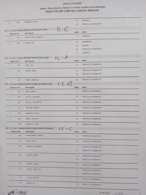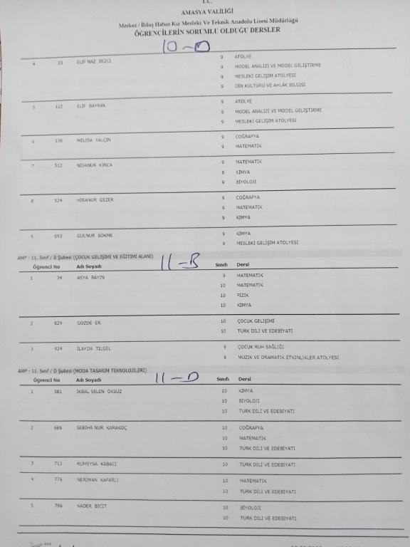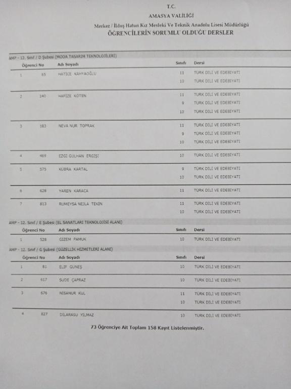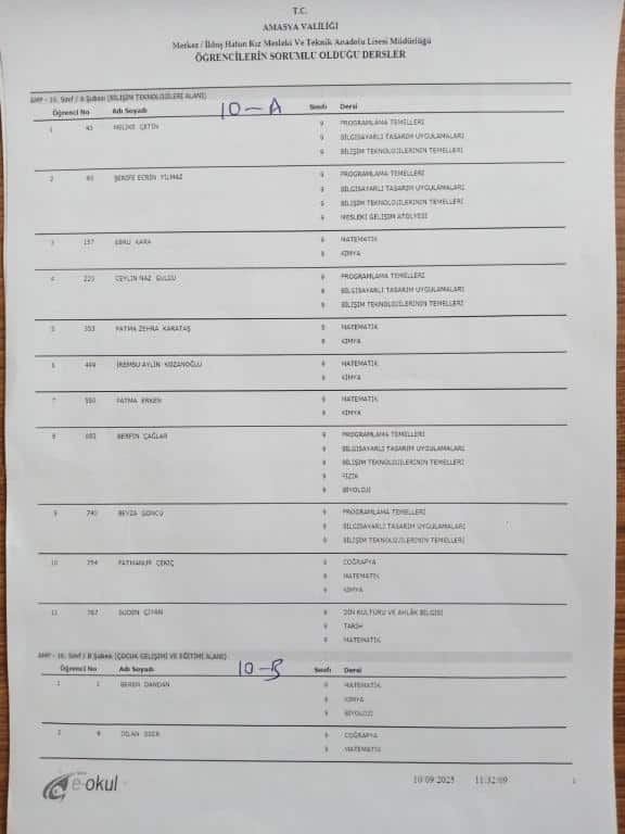 Öğrencilerimizin sorumlu oldukları derslerin listeleri;